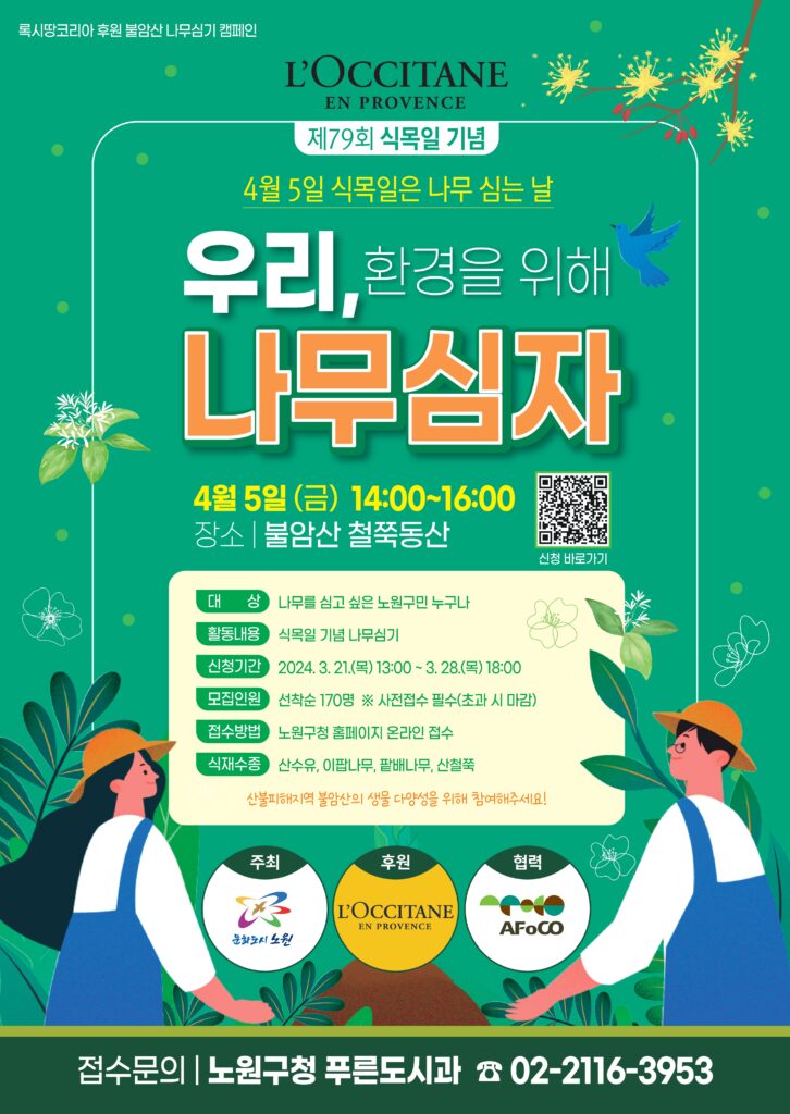 Jointly organized by L’Occitane Korea (sponsor), AFoCO, and Nowon District Office of Seoul Metropolitan City, ‘Planting Trees Together for the Environment’ celebrates the 79th Korean Arbor Day and aims to respect biodiversity and rehabilitate wildfire-affected areas of Bulam Mountain. This initiative is part of L’Occitane’s six commitments to regenerate biodiversity and preserve the environment. Held on April 5, 2024, at Azalea Park, Bulam Mountain Healing Town, the event highlights the importance of planting various tree species in safeguarding against biodiversity loss caused by forest fires.