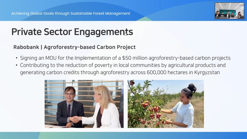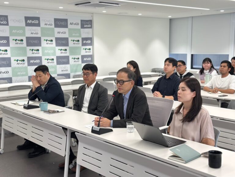 The session provided insights into private sector efforts toward sustainable forests and fostered opportunities for businesses to collaborate with AFoCO on impactful forest projects. The event was conducted in English with simultaneous interpretation provided in Korean.