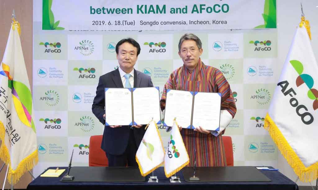 AFoCO, in the spirit and consistency with existing international processes, cooperation mechanisms, and standards, set the general cooperation framework with the Korea Institute of Arboretum Management (KIAM). Mr. Chencho Norbu of AFoCO and Mr. Kim Yong-ha of KIAM signed an MOU on 18 June 2019 at Songdo during the occasion of the Asia-Pacific Forestry Week 2019.