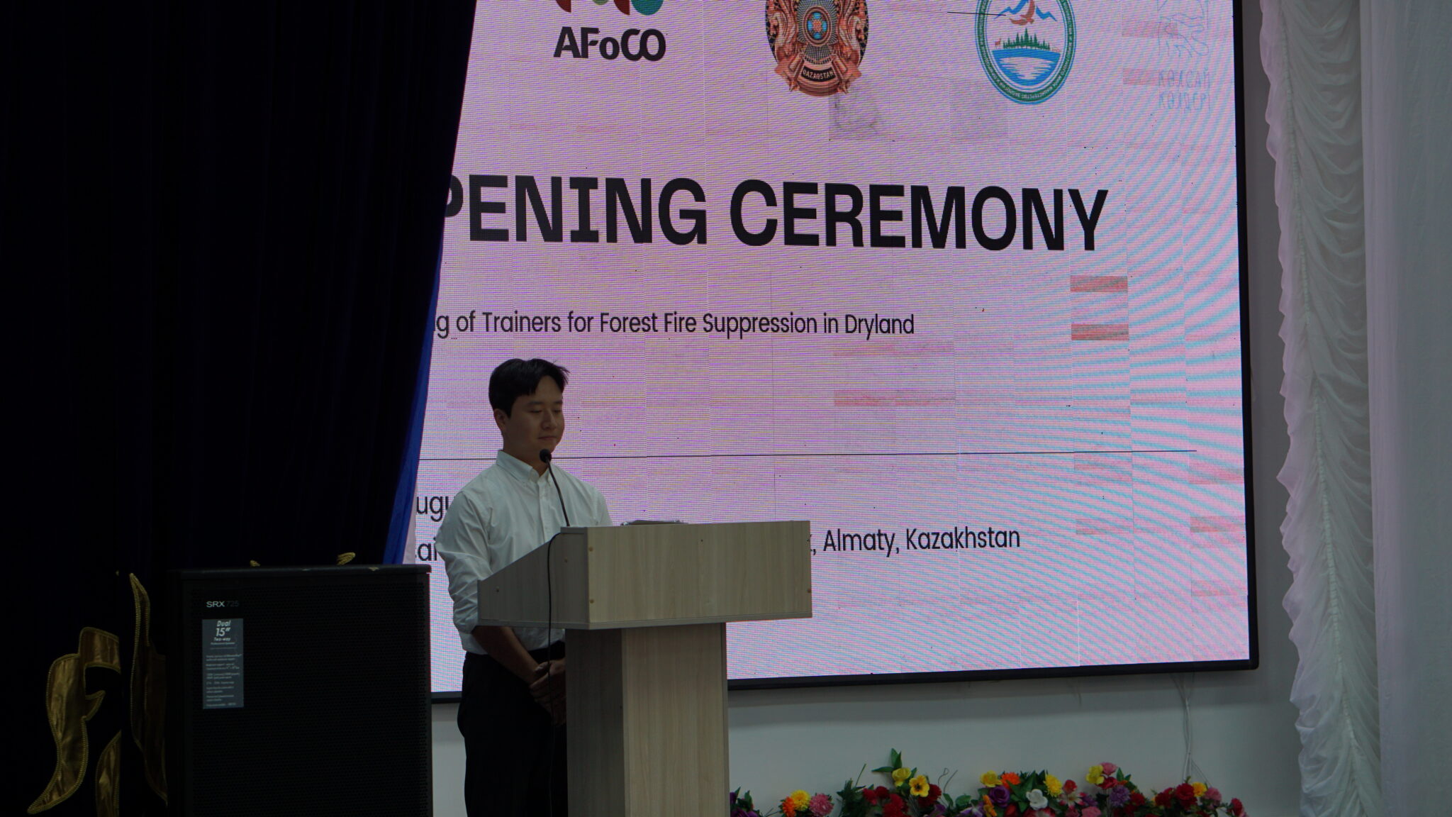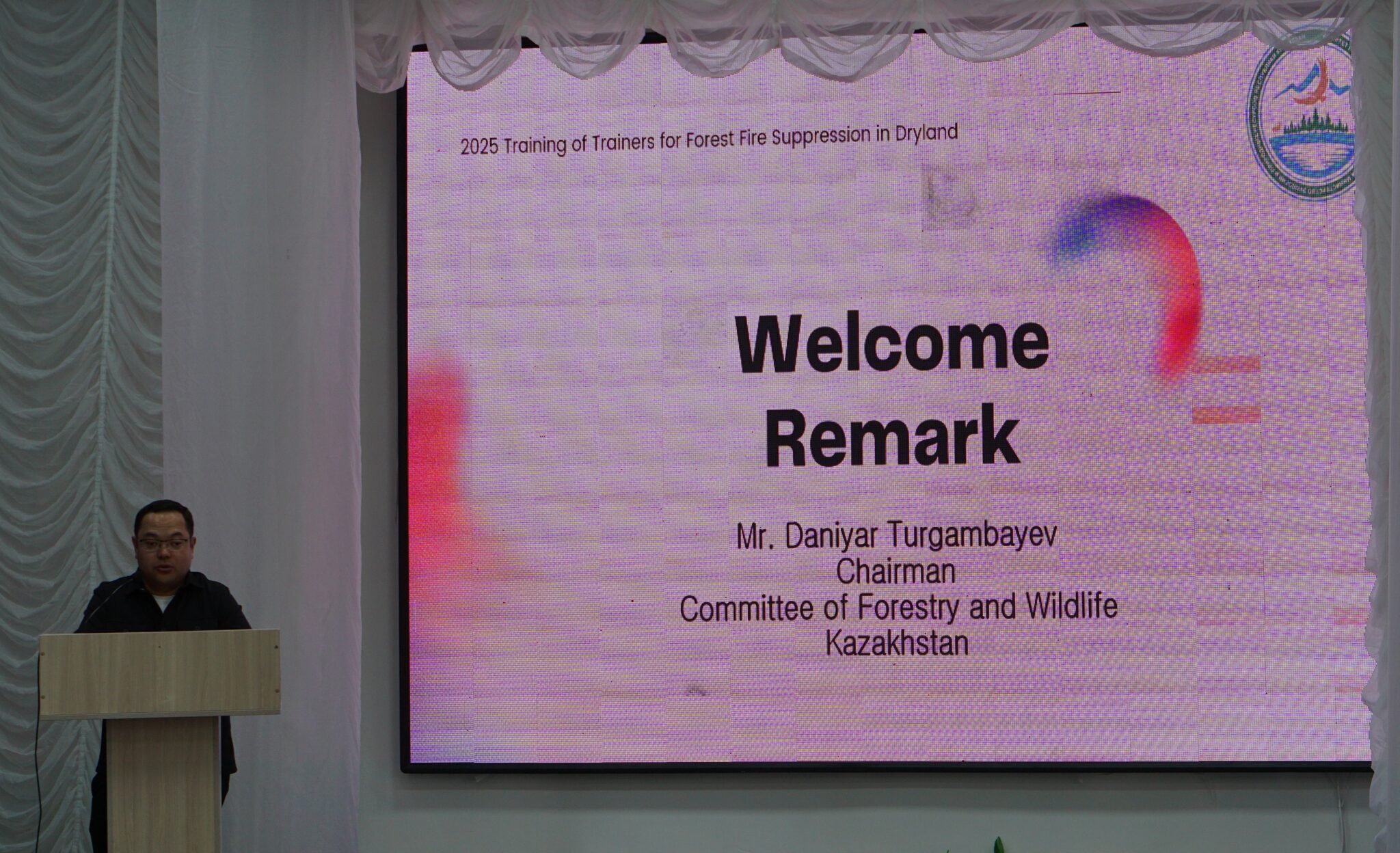Dr. Tongil Kim, Director of the AFoCO Secretariat, opened the ceremony by highlighting the growing threat of forest fires in Asia, citing Kazakhstan’s nearly 300 forest fires in 2024. Dr. Kim emphasized that the training is a core activity under the FFMA Initiative, designed to build a multiplier effect as participants return home to replicate knowledge through national training programs.