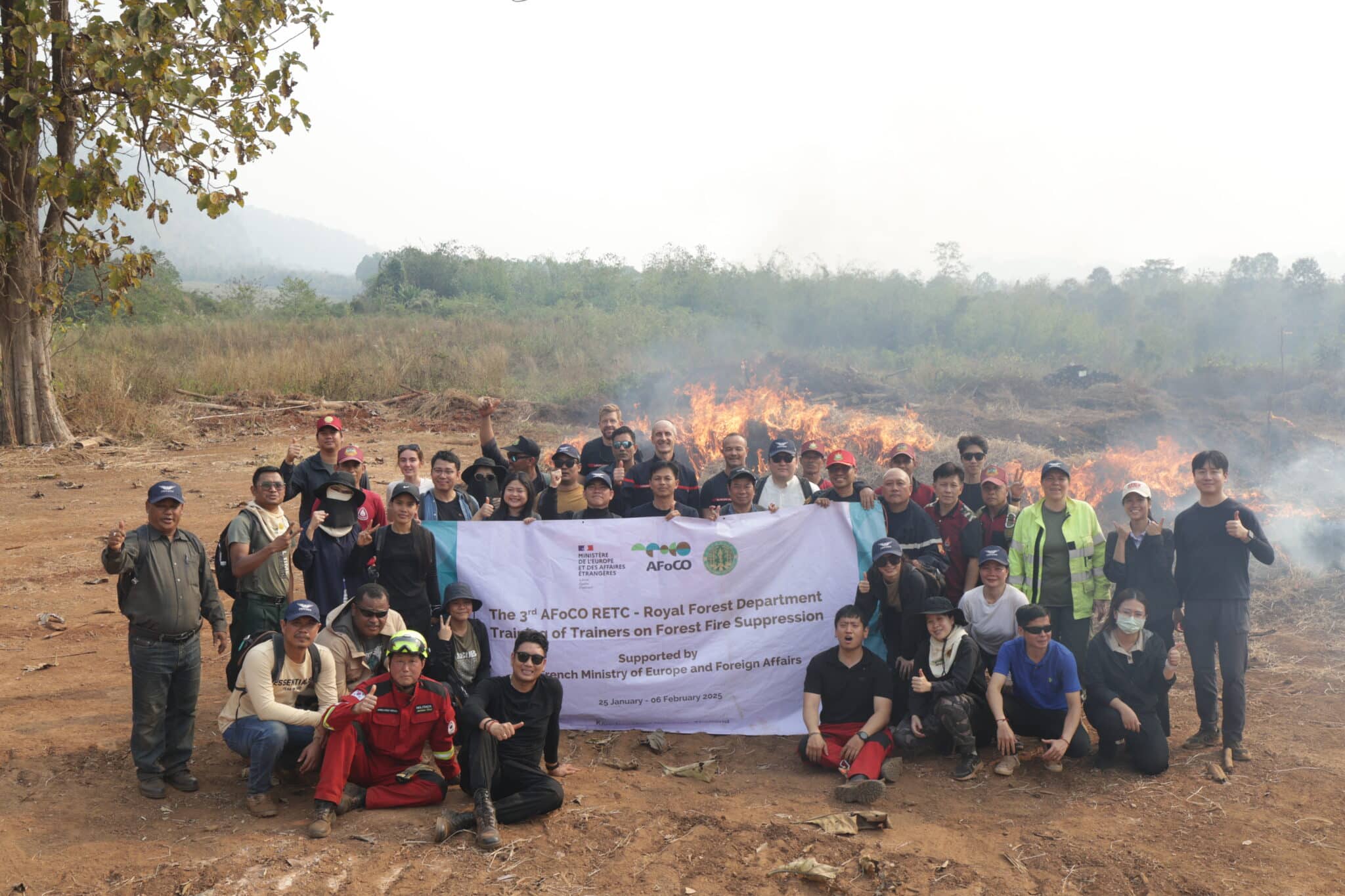 The 3rd Training of Trainers for Forest Fire Suppression, held from January 25 to February 6, 2025, in Kanchanaburi, Thailand, concluded successfully, reinforcing regional capacity and expertise in forest fire response. Organized by the Asian Forest Cooperation Organization (AFoCO) in collaboration with the Royal Forest Department of Thailand (RFD) and supported by the French Ministry of Europe and Foreign Affairs, the program provided advanced training for fire suppression practitioners from across the region.
