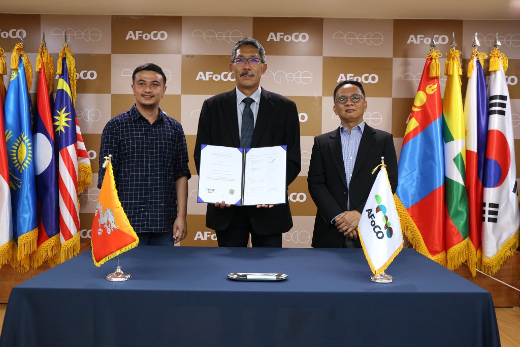 Mr. Chencho Norbu, Executive Director of the AFoCO, initiated the signing of a Memorandum of Understanding (MoU) with the Royal Government of Bhutan for the implementation of a research project on “Assessment of Adelgid diversity and distribution in conifer forest of Bhutan to mitigate future outbreaks”. The research project will be implemented by the Ugyen Wangchuck Institute for Conservation and Environmental Research (UWICER), a forestry research institute under the Department of Forests and Park Services.