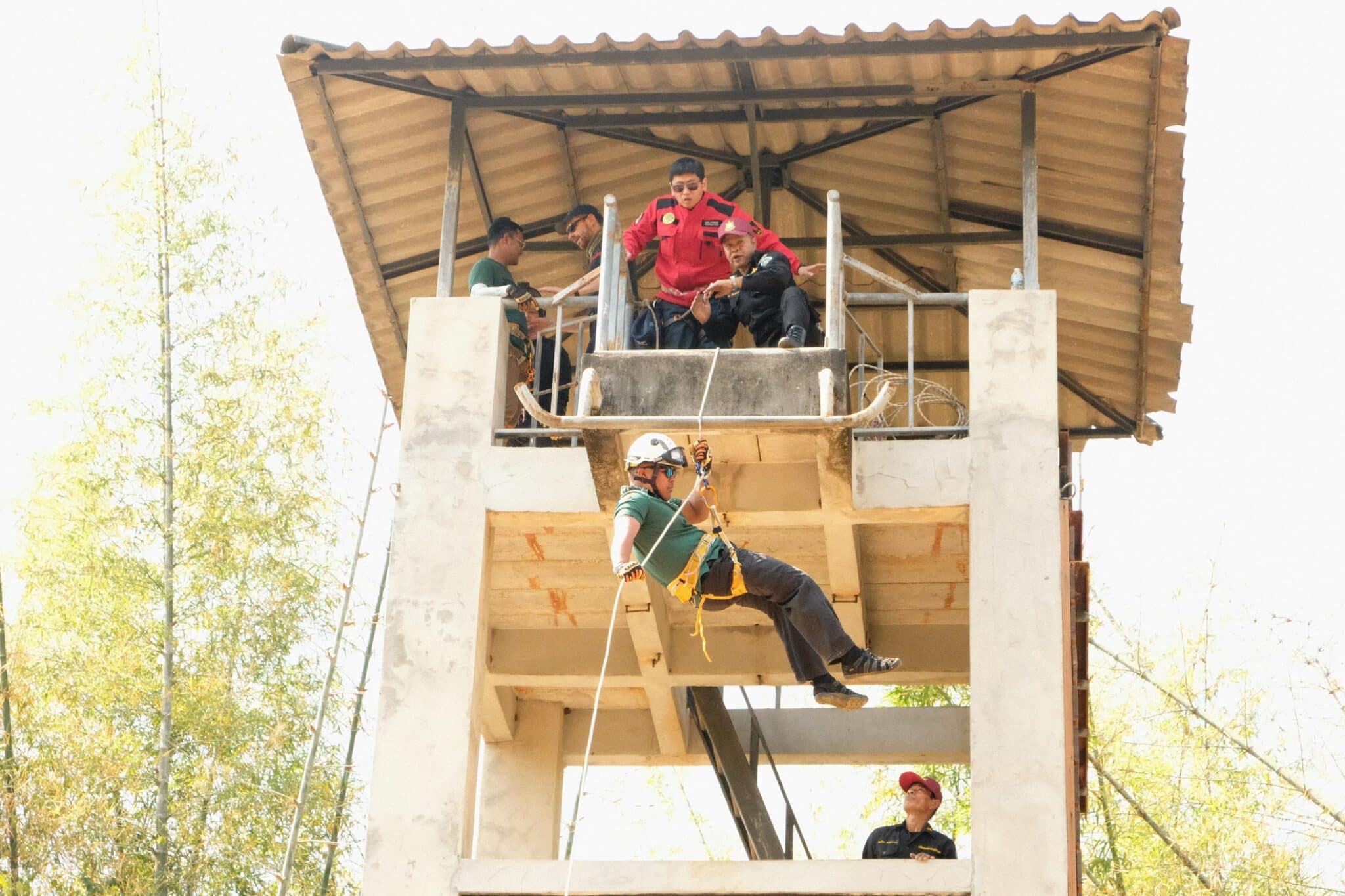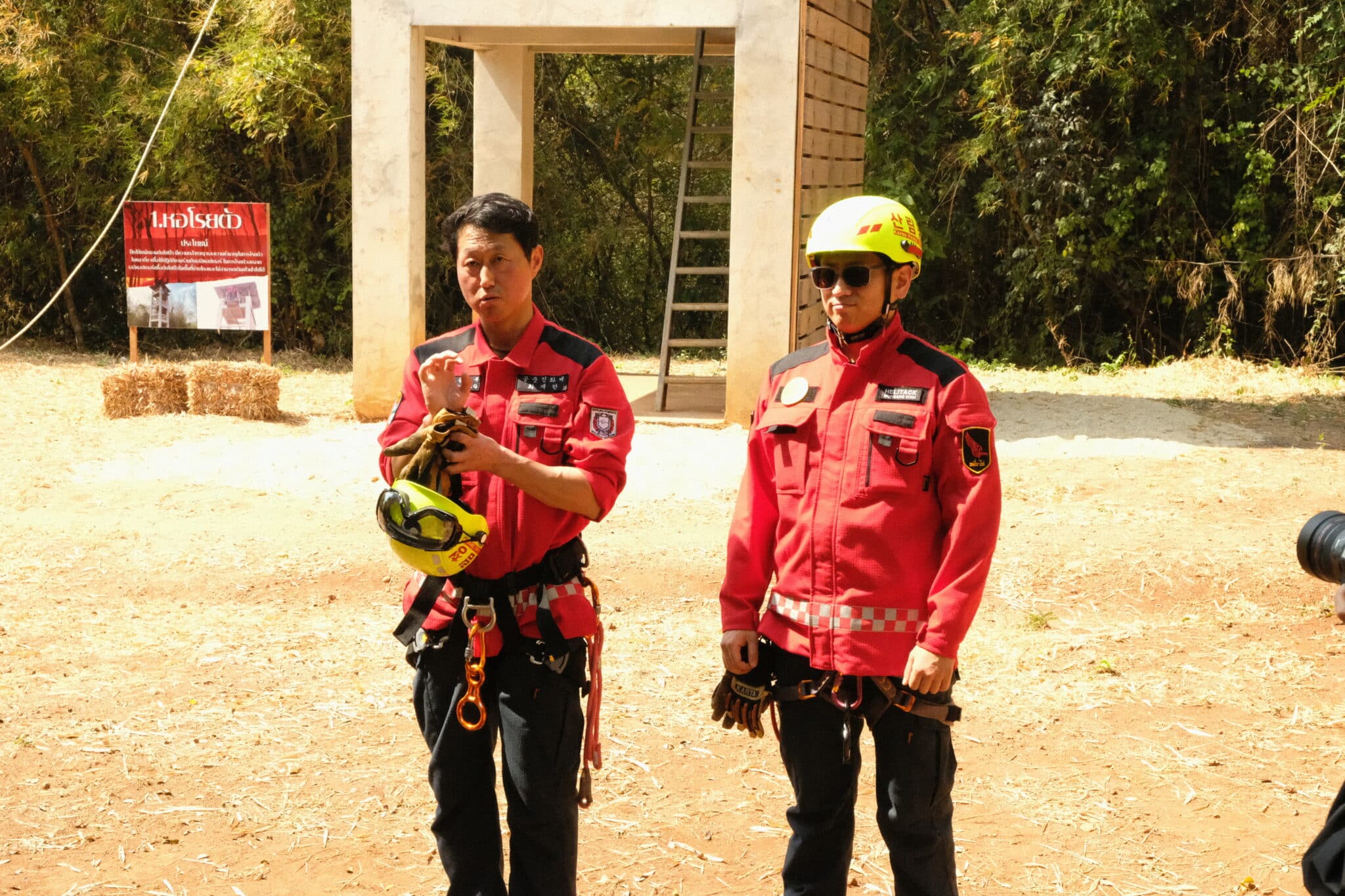 Rappelling Exercise: Participants also underwent rappelling training, simulating aerial deployment techniques used by aerial firefighter of Korea Forest Service. Using harnesses and ropes, trainees descended from a 15-meter training tower, practicing swift and controlled landings to access fire-prone areas efficiently. This technique ensures that firefighters can be rapidly and safely deployed to exact forest fire locations, increasing the effectiveness of suppression operations. The exercise emphasized precision, safety, and adaptability in difficult terrain conditions, preparing participants for real-life forest fire response scenarios.