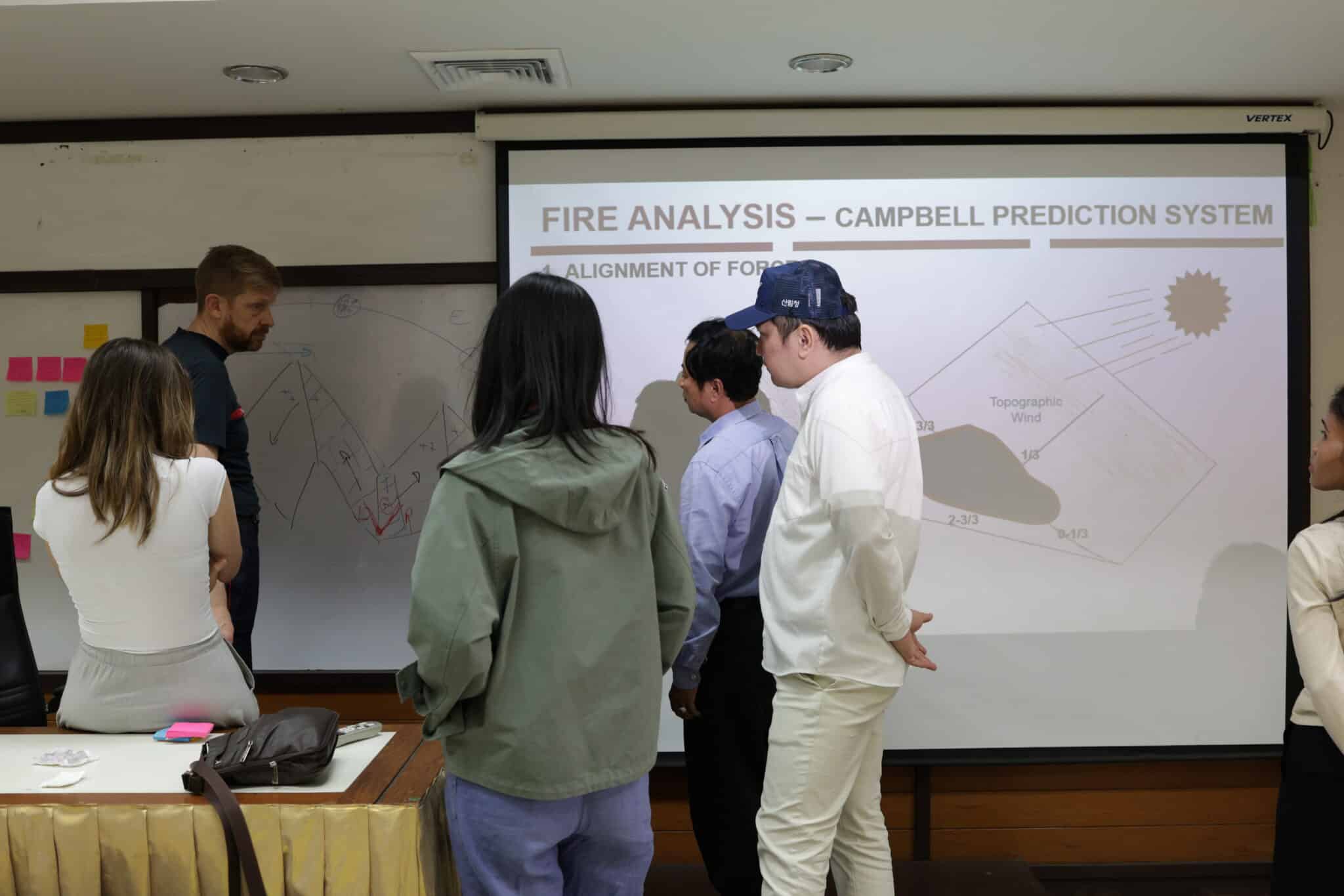 One of the core modules of the training focused on Fire Analysis and Behavior. Rather than solely relying on theoretical instruction, participants actively explored ways to apply these concepts within their respective forest environments. Using the Fire Behavior Triangle, they systematically analyzed the interaction between fuel, weather, and topography, conducting simulations to predict fire spread patterns under various conditions. This process provided AFoCO Member Countries with valuable opportunities to enhance their ability to forecast and respond to forest fire spread effectively.