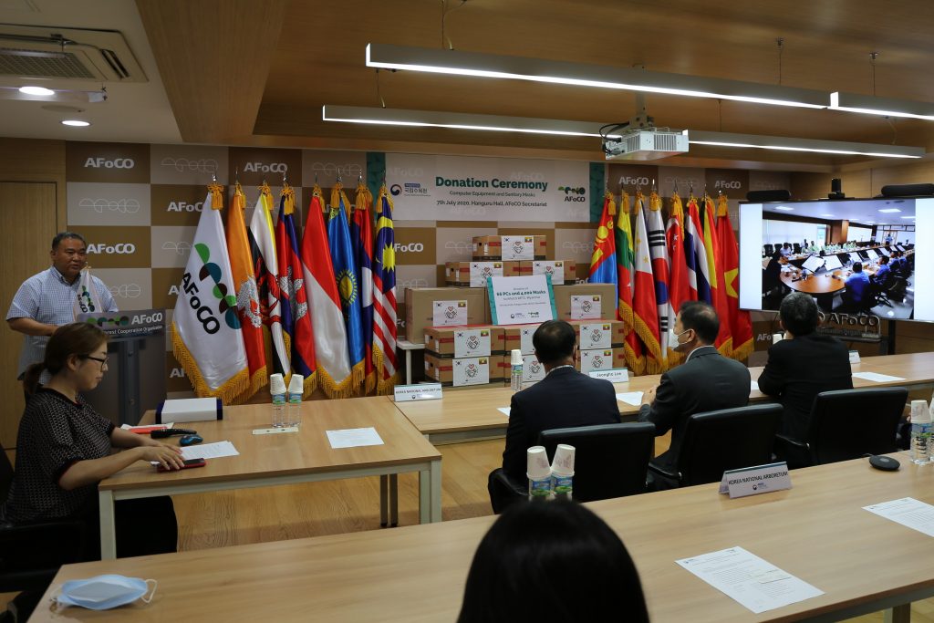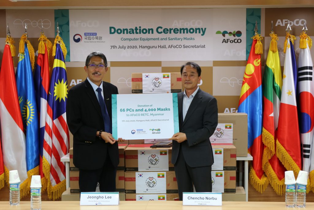 AFoCO is happy to receive a donation of 66 computer equipment and 4,000 face masks from the Korea National Arboretum (KNA). The donated items will be sent to the AFoCO RETC in Myanmar for use in capacity building activities and to help maintain a safe working environment for government officials in Myanmar.