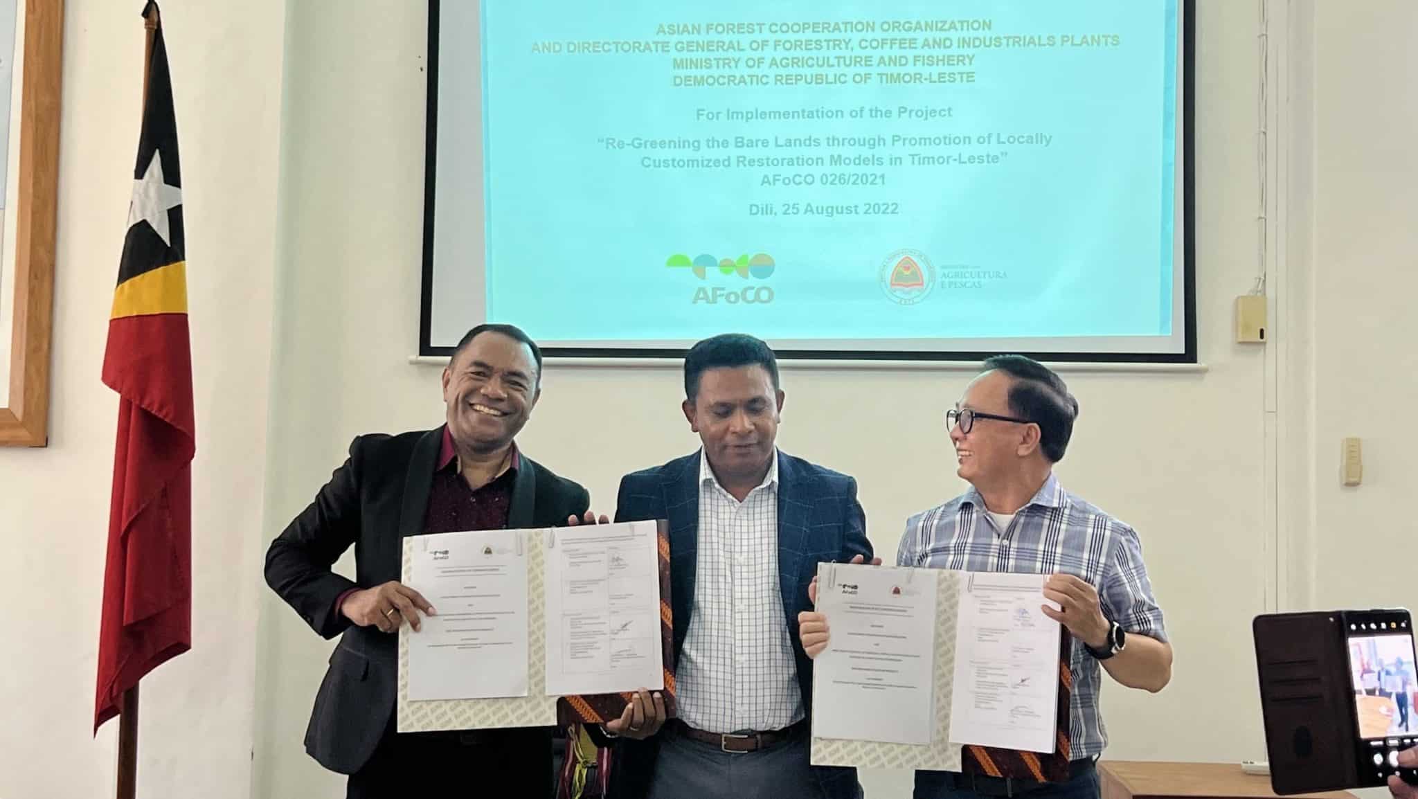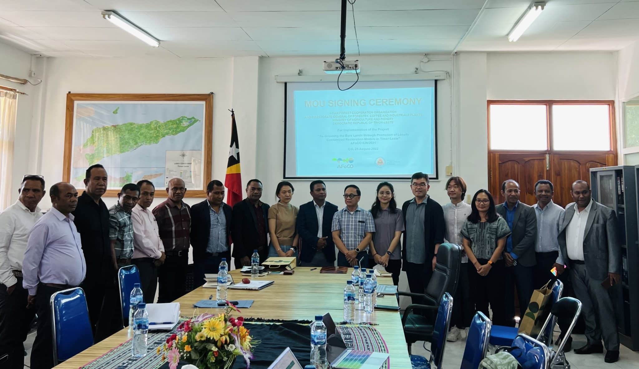 August 25, 2022 — the MoU signing ceremony for the 2nd AFoCO project in Timor-Leste titled, “Re-greening the bare lands in Timor-Leste through the promotion of locally customized restoration models” (AFoCO/026/2021) took place in the office of the General Directorate of Forestry, Coffee, and Industrial Plants of the Ministry of Agriculture and Fishery in Dili, Timor-Leste. The MoU signing ceremony was attended by the Minister of the Ministry of Agriculture and Fishery, H.E. Pedro dos Reis, who was present as a witness to the party for Timor-Leste. In the brief discussions that took place during the signing ceremony, he emphasized that best efforts should take place for reforestation and rehabilitation in Timor-Leste and the project importance of the launching of the 2nd project and the rehabilitation and reforestation efforts.