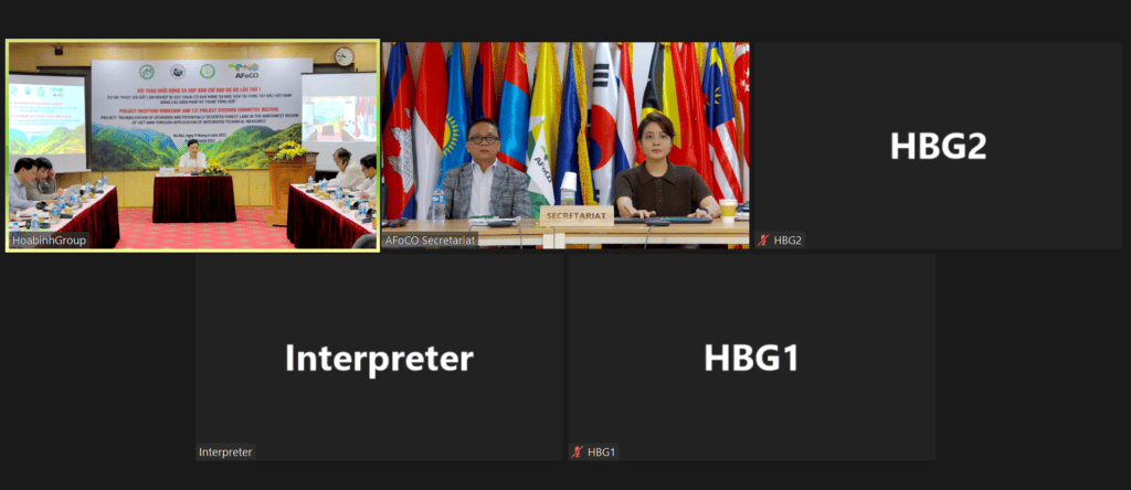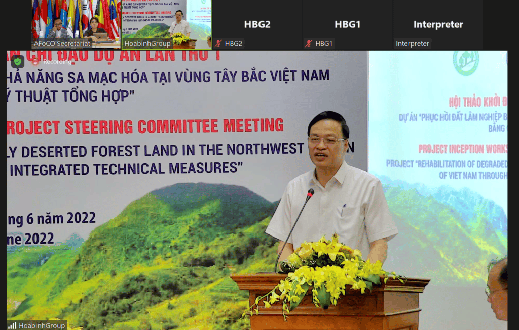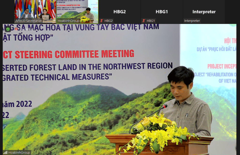 June 9, 2022 — the Project Inception Meeting and the 1st Project Steering Committee Meeting were held via online for the implementation of the project Rehabilitation of Degraded and Potentially Deserted Forest Land in the Northwest Region of Viet Nam through Application of Integrated Technical Measures (AFoCO/031/2022). The meetings were joined by representatives from the Research Institute for Forest Ecology and Environment (RIFEE), which is the Implementing Agency (IA), the Vietnamese Academy of Forest Sciences (VAFS), Viet Nam Administration of Forestry (VAF), and the AFoCO Secretariat. The participants warmly greeted each other and each side made brief introductions of the participants.