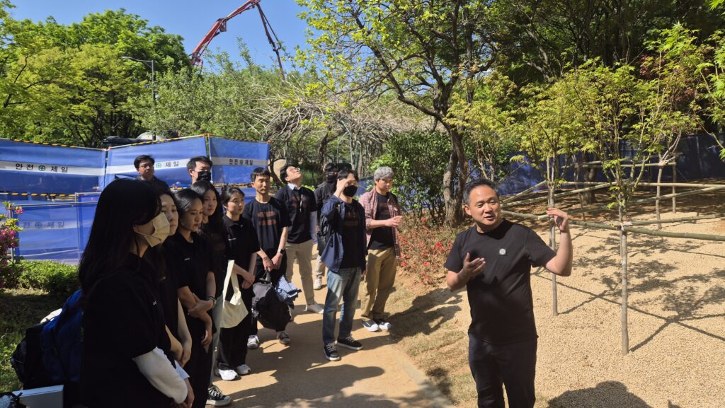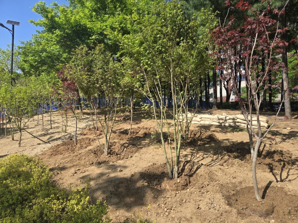 Inspiration for the planting concept was drawn directly from Mapletree Korea’s corporate identity. A variety of maple trees—including Acer pseudosieboldianum, Acer palmatum var. atropurpureum, and Acer palmatum ‘Bloodgood’—were carefully selected and planted across the site. A total of 63 maple trees were planted, taking into consideration the site’s partially shaded conditions. The planting layout was designed to complement the elongated shape of the area, allowing joggers and pedestrians to enjoy scenic views of the trees as they pass by.