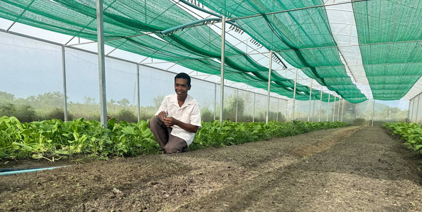 Mr. Meuk Da, one of the selected farmers joining to establish an integrated farming demonstration site, in his greenhouse preparing soil and irrigation system for organic vegetable cultivation