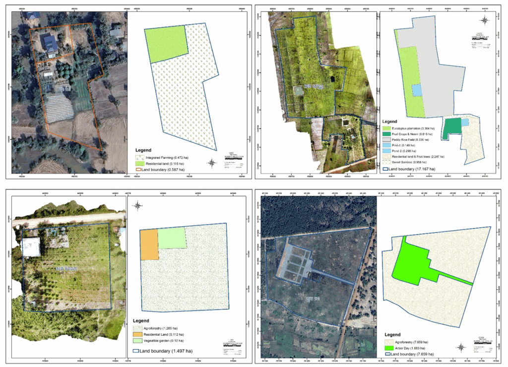 The integrated farming technique was introduced to the selected farmers by applying a holistic agricultural approach which different production systems, such as crops, livestock, fruit tree, forest tree and aquaculture, are combined and managed to bring about multi-purpose benefits via promoting environmental sound, agricultural diversification and productivity improvement, minimizing input costs, improving sustainability, and enhancing climate change resilient capacity as well as increasing income. Based on the need assessment and interest of each demo farmers, every demonstration site was designed combined with drone photos. A plan map for demonstration site preparation and crop cultivation was developed under close consultation with individual demo farmer.