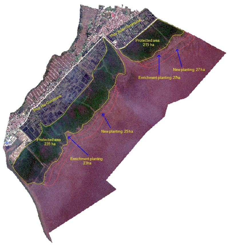 Thai Binh is a coastal province in the Red River Delta of Vietnam with a total land area of 154,650 hectares. The province has seven districts of which two are coastal – Tien Hai and Thai Thuy. The coastline of these districts is around 54 km and the coastal sandy (poor soil) and coastal warp (rich in humus) are the two major groups of soils found in these areas. The forest of the province is mainly composed of mangrove species that traditionally provided timber, firewood, non-wood forest products including rich habitat for flora and fauna species amongst others. These mangrove forests protect local coastal areas by reducing the impacts of flooding, erosion, and salinization of coastal areas. There were also large areas of mangrove forest of poor quality with low density that limit its role in coastal area protection and conservation. By maintaining healthy coastal ecosystems, like mangroves, seagrass beds or coral reefs, can provide soft protection and other benefits according to the IPCC special report on Ocean and Cryosphere in Changing Climate. The report also cited that the failures of mangrove restoration projects were due to poor choice of mangrove species, planting in the wrong tidal zones, and in areas of excessive wave energy.
