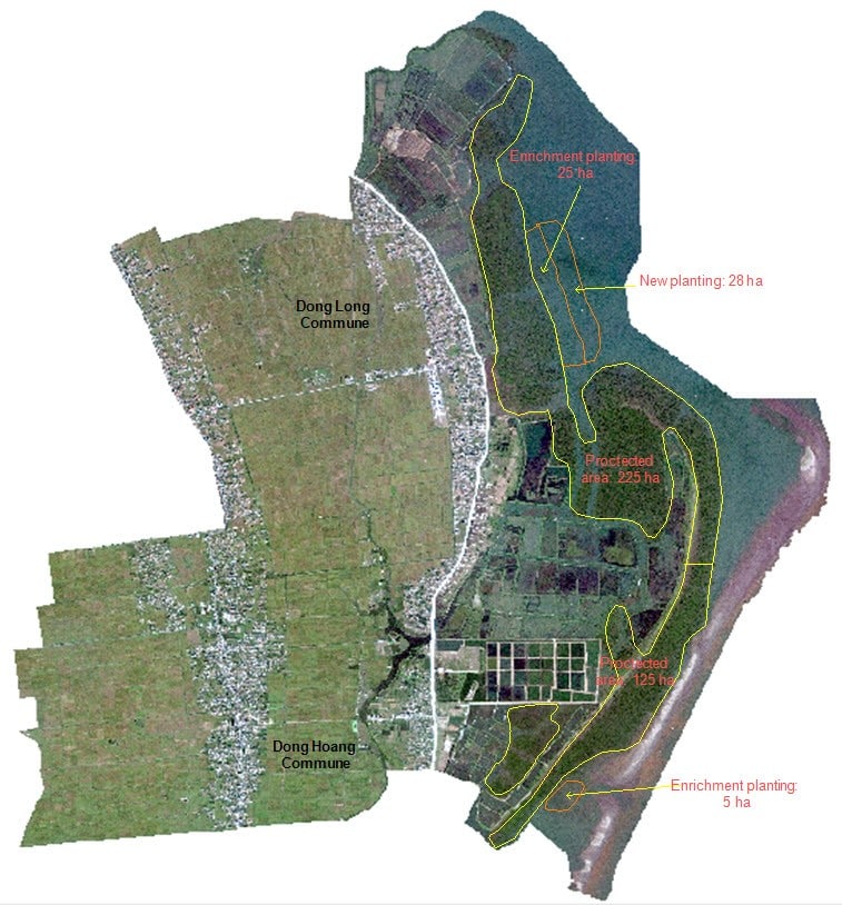 The project site maps for the afforestation (80 ha), enrichment (80 ha) and protection (800 ha) areas of the two districts covering four communes (Thuy Hai and Thuy Xuan of Thai Thuy district, and Dong Long and Dong Hoang of Tien Hai district) were produced based on detailed field surveys carried out in 2015 and 2016 (Maps 1 and 2). The seedlings for afforestation were produced at upstream nurseries and transported by boat through the river canals to the plantation sites. The plantations were carried out at low tide from the end of March through the end of September for three years between 2016 and 2018. The species selected were Sonneratia caseolaris, Kandelia obovate, and Avicennia marina. One of the adaptation measures under the NDCs is to protect, restore, plant, and improve the quality of coastal forests, including mangroves, especially in coastal estuaries and the Mekong and Red River deltas.