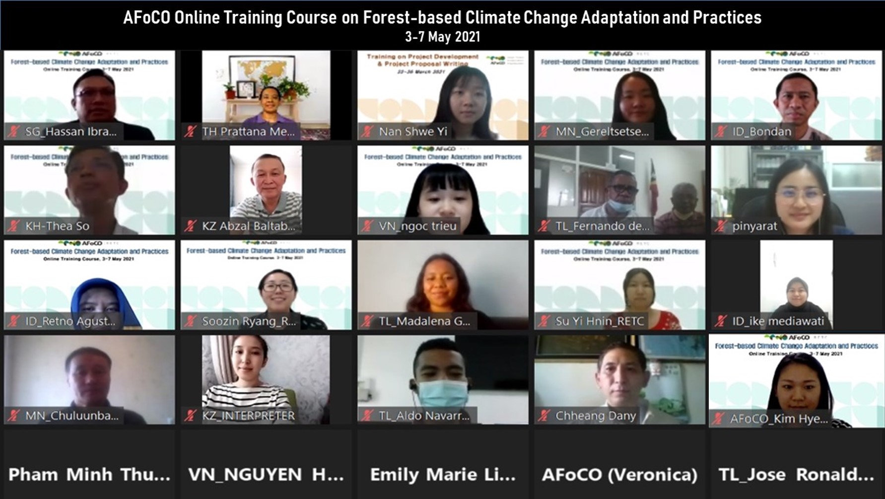 The AFoCO RETC Regular Training on “Forest-based Climate Change Adaptation and Practices” (FBCCA) was conducted online from 3 to 7 May 2021. AFoCO welcomed 45 government officials and forestry experts in climate change adaptation and related work from 12 member countries. Speakers from Chiang Mai University, Kasetsart University, Center for International Forestry Research (CIFOR), The International Tropical Timber Organization (ITTO), the National Parks Board of Singapore, and the Oscar M. Lopez Center of the Philippines were invited to share knowledge and insights on climate change adaptation.