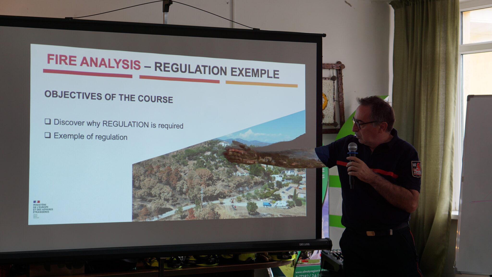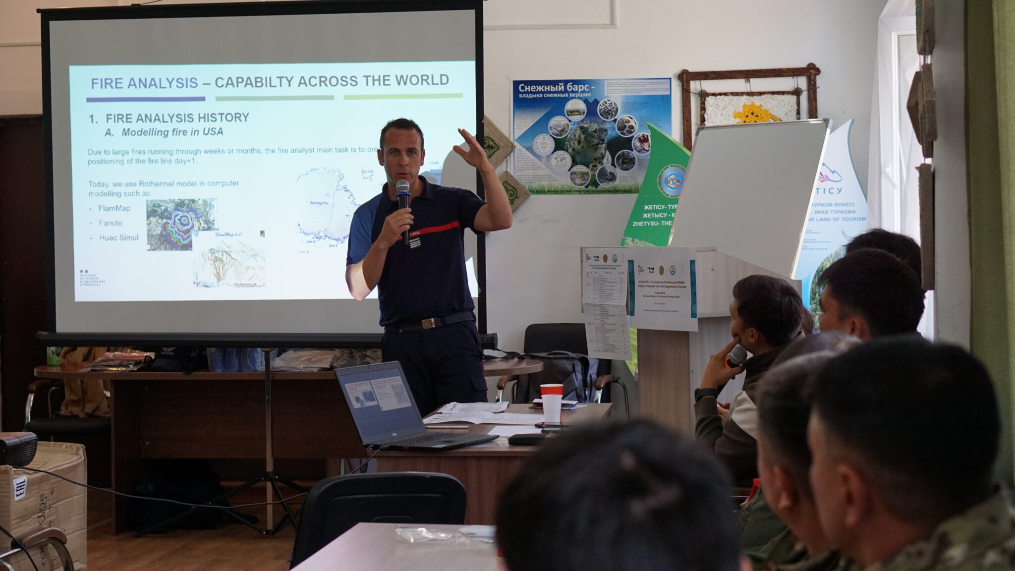 The training began with lectures from French experts on Fire Behavior Analysis, centered on the Fire Behavior Triangle, the interactions of Fuel, Weather, and Topography. Participants learned how steep slopes accelerate fire spread, how low-humidity increases ignition probability, and how these factors combine to drive forest fire intensity and direction.
