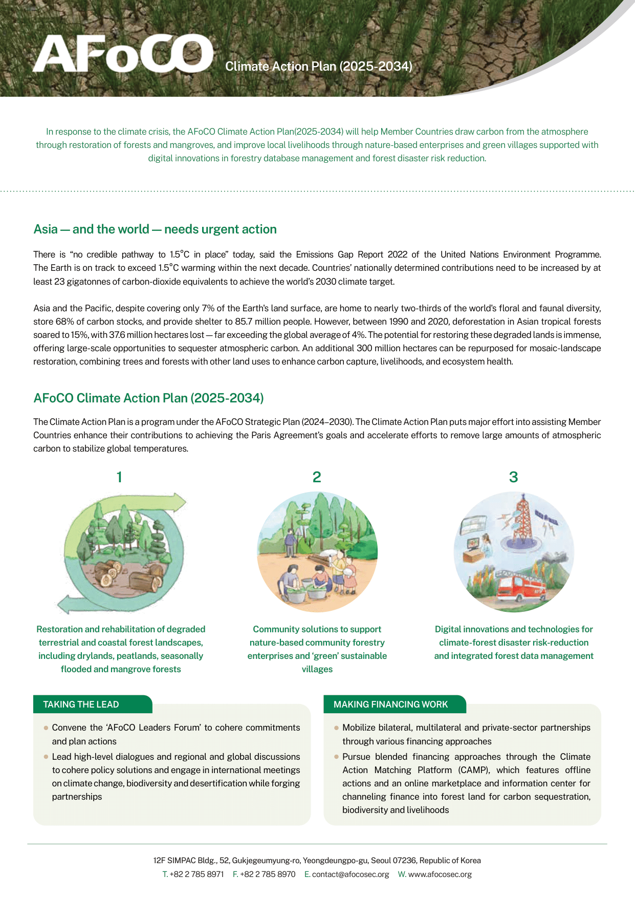 The AFoCO Climate Action Plan is a program under the AFoCO Strategic Plan (2024–2030). The Climate Action Plan puts major effort into assisting Member Countries enhance their contributions to achieving the Paris Agreement’s goals and accelerate efforts to remove large amounts of atmospheric carbon to stabilize global temperatures