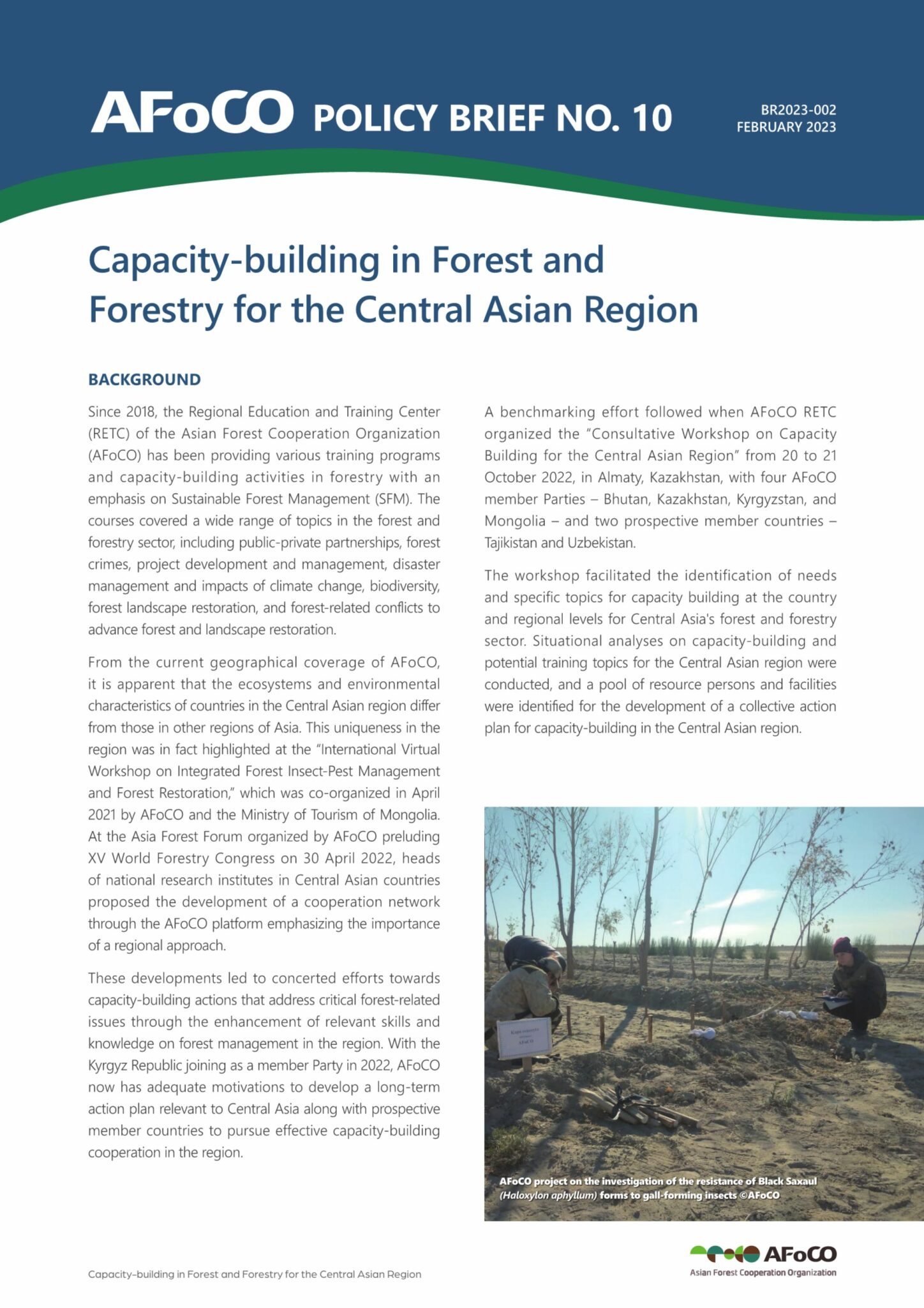 Recognizing the importance of a framework for partnership with countries in the Central Asian region, finally, AFoCO RETC organized the “Consultative Workshop on Capacity Building for the Central Asian Region” from 20 to 21 October 2022, in Almaty, Kazakhstan, with four AFoCO member Parties – Bhutan, Kazakhstan, Kyrgyzstan, and Mongolia – and two prospective member countries — Tajikistan and Uzbekistan. The workshop intended to identify the needs and specific topics for capacity building at the country and regional levels for Central Asia’s forest and forestry sector. A situational analysis of capacity-building and potential training topics for the Central Asian region was conducted, and a pool of potential resource persons and facilities was identified for the development of a collective action plan for capacity-building in the Central Asian region.